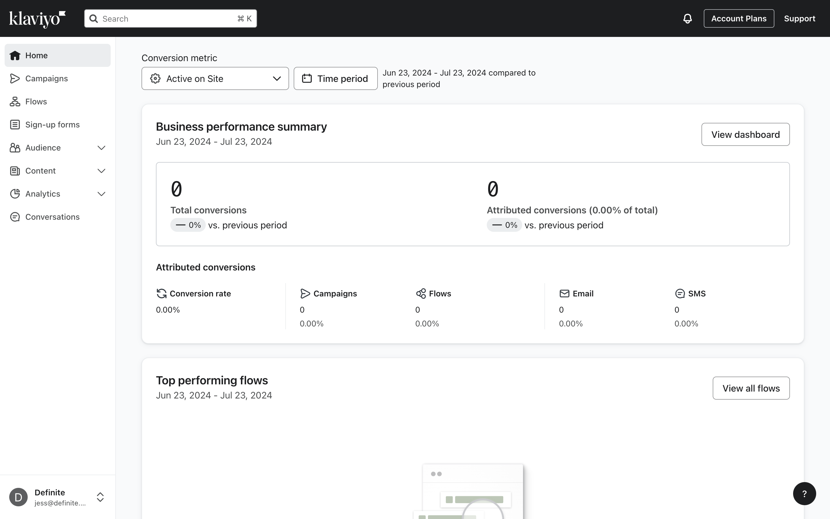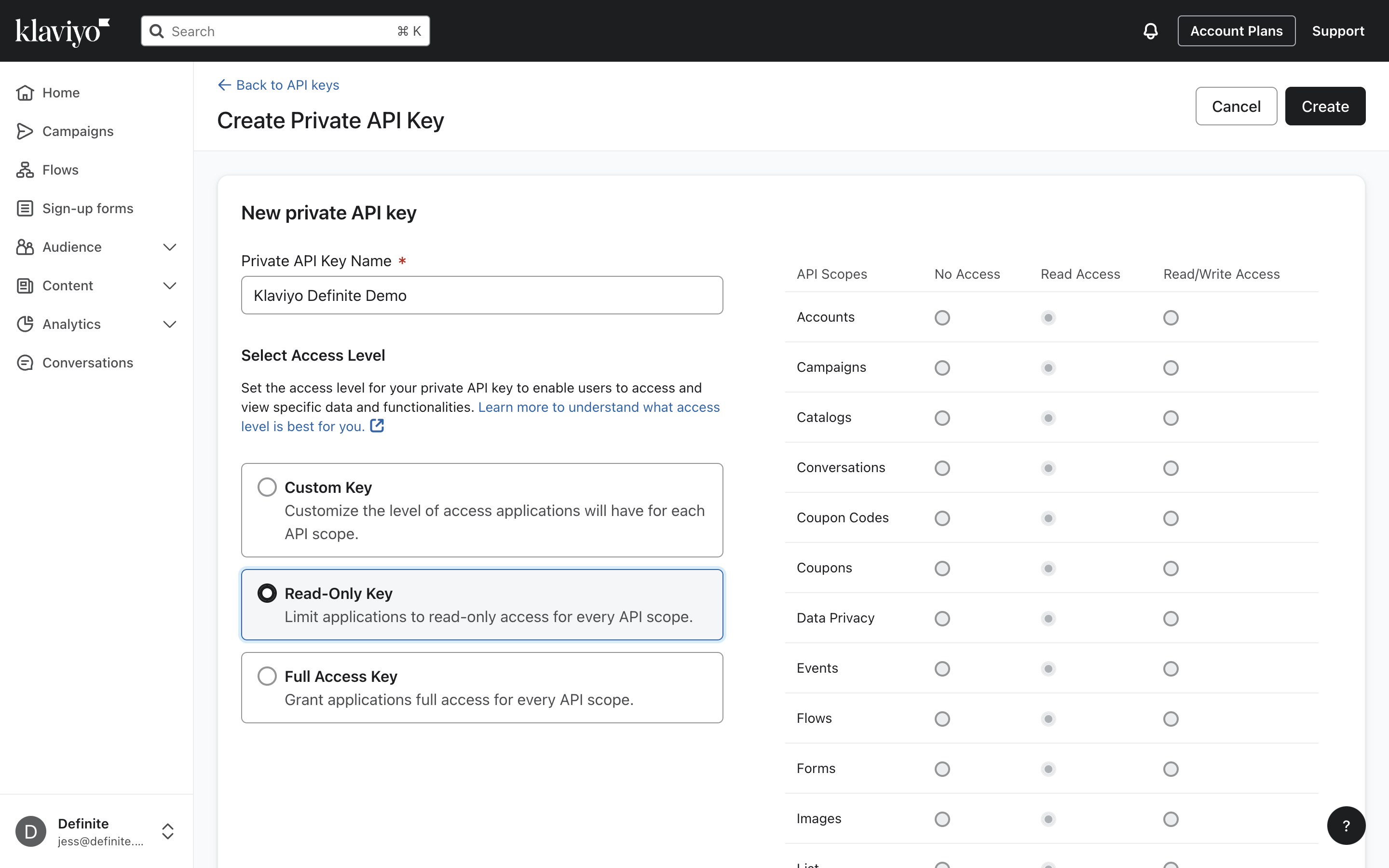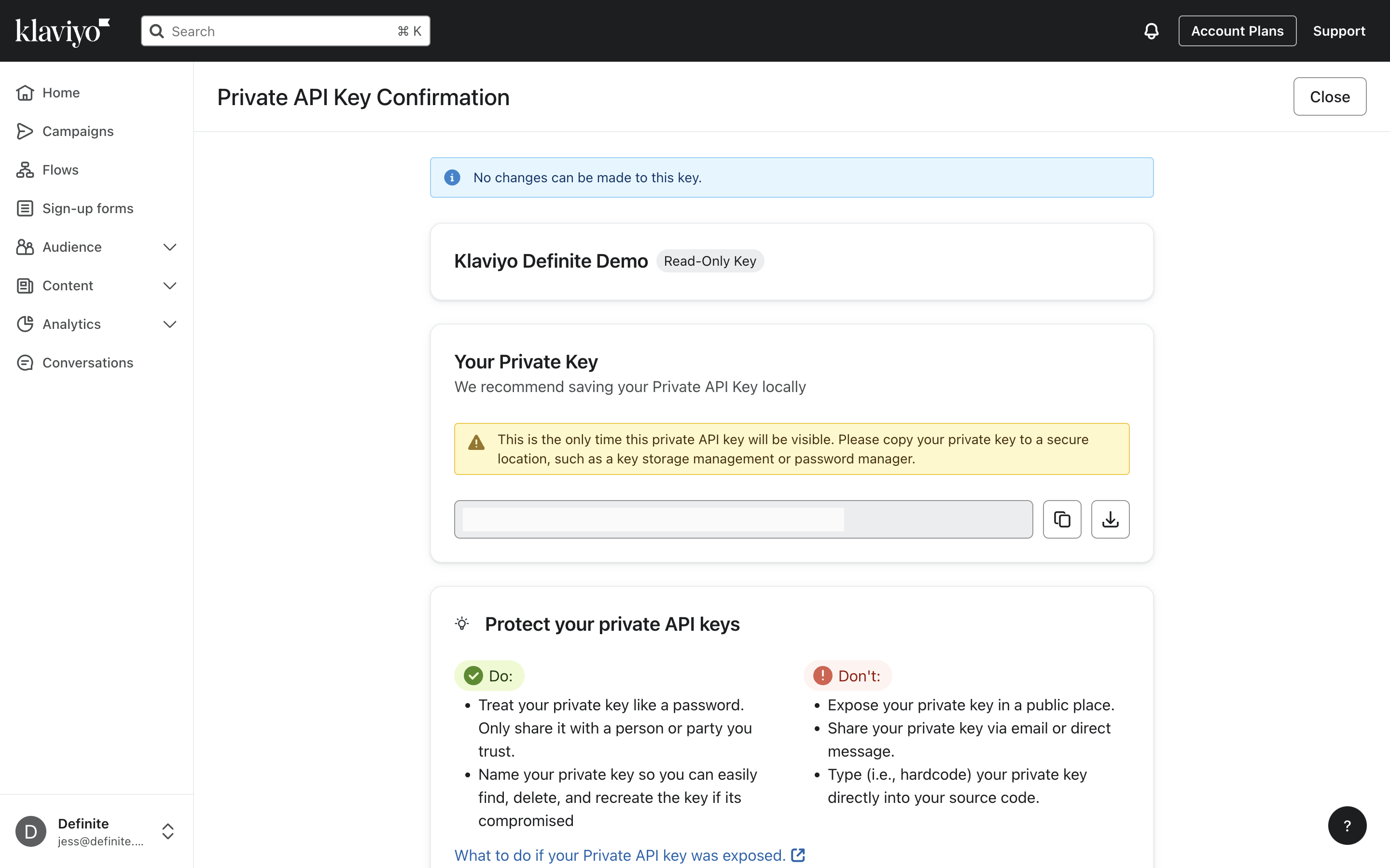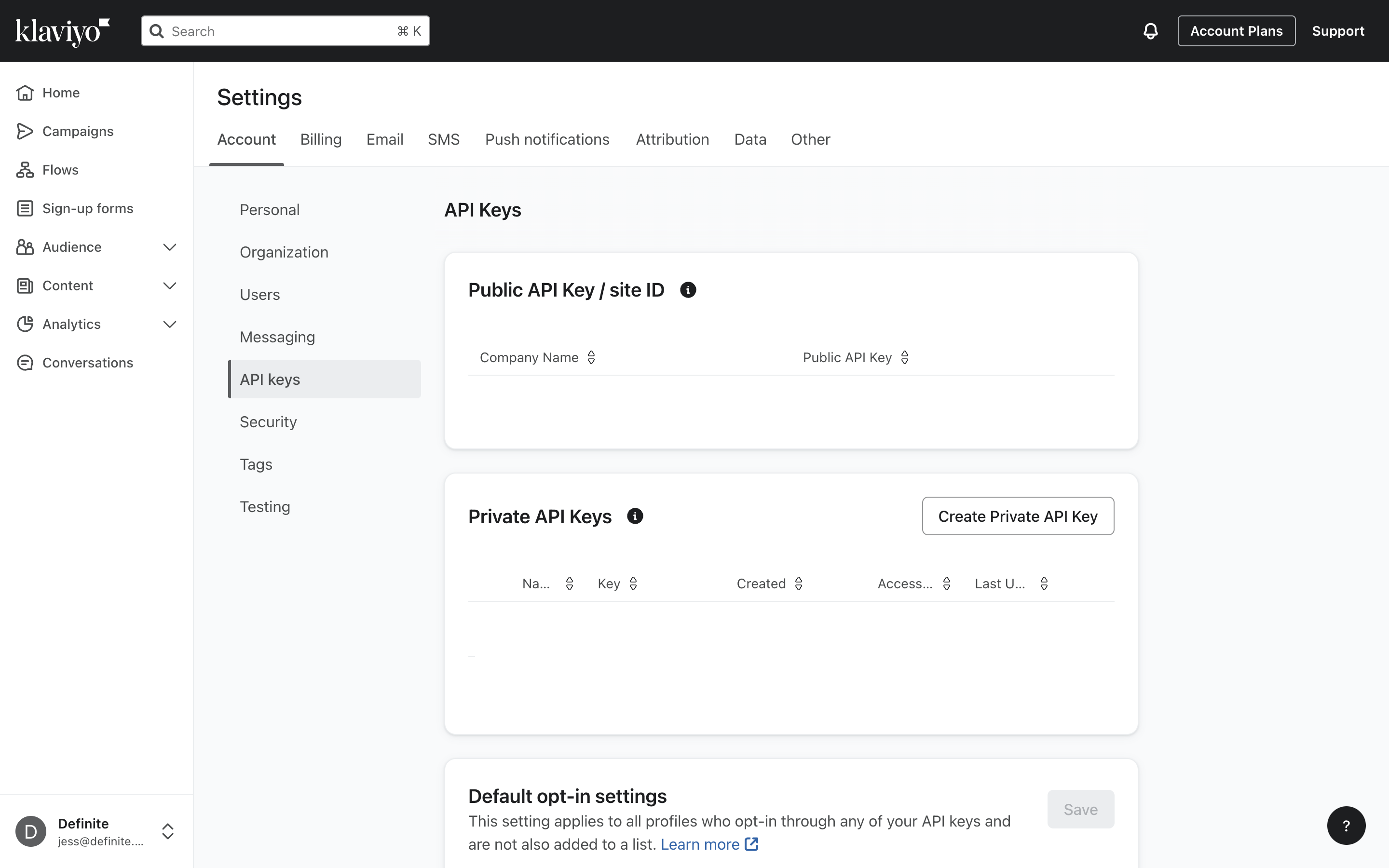 In order to allow Definite to retrieve data from your Klaviyo account, we’ll need to get your Private API Key.1