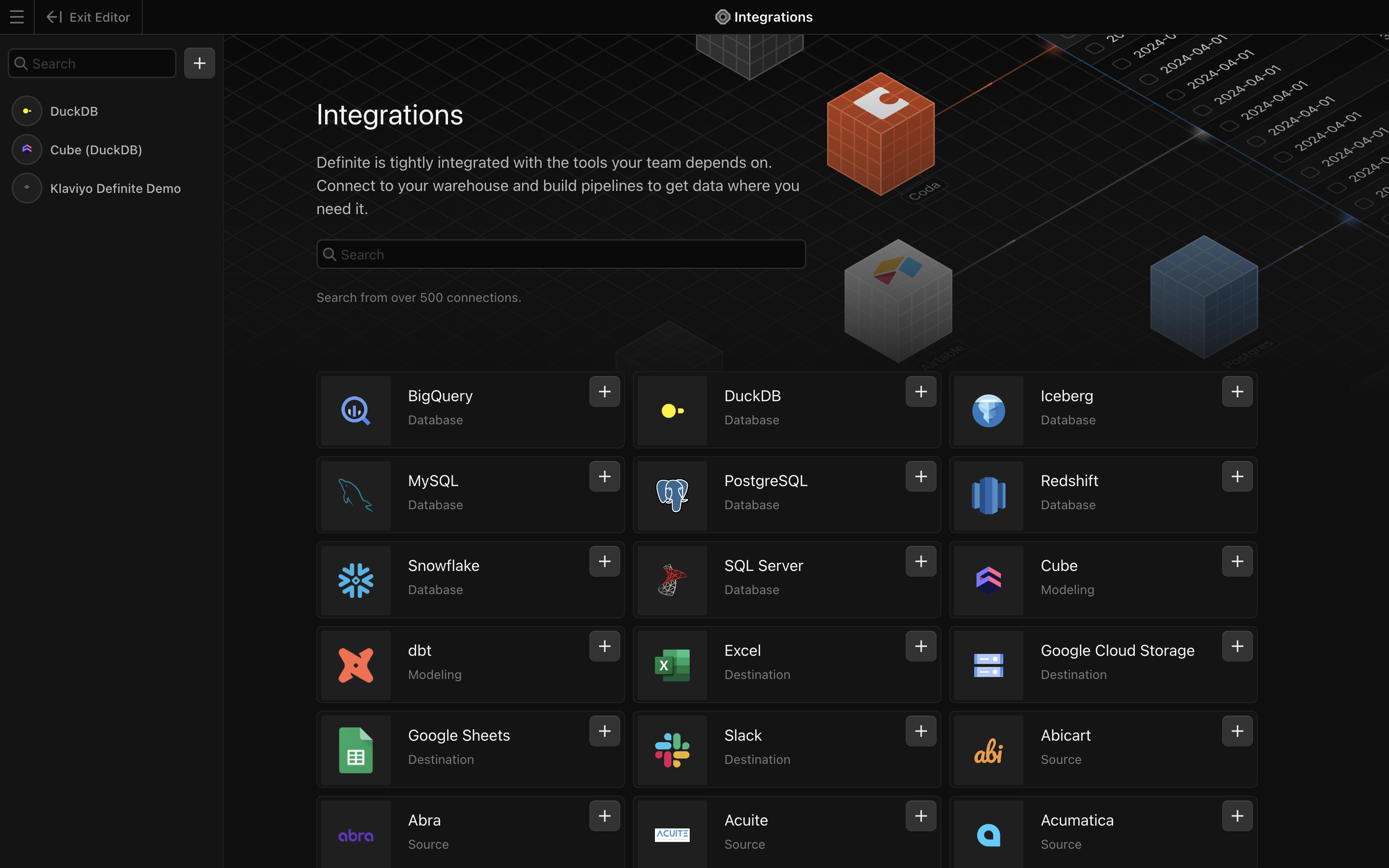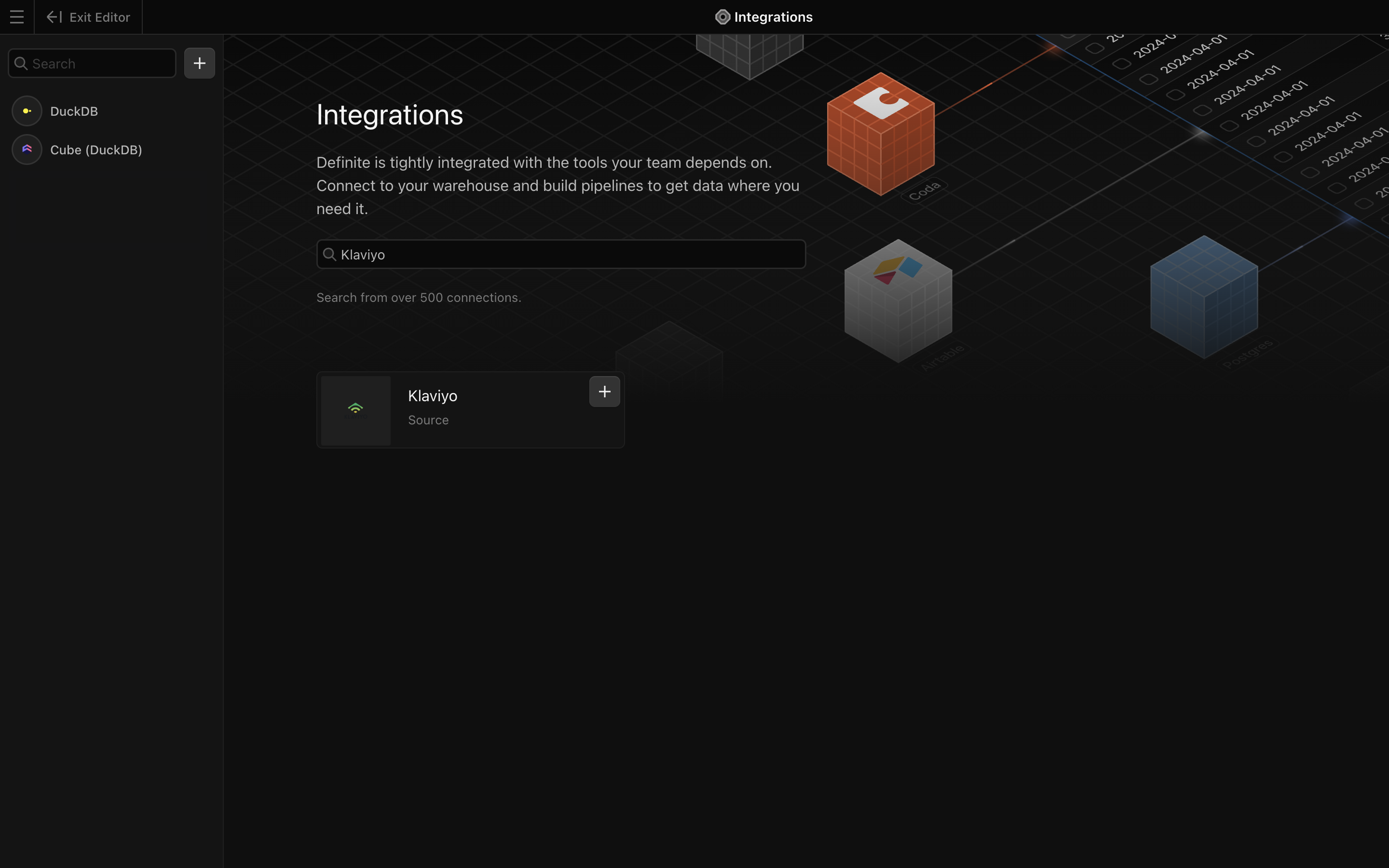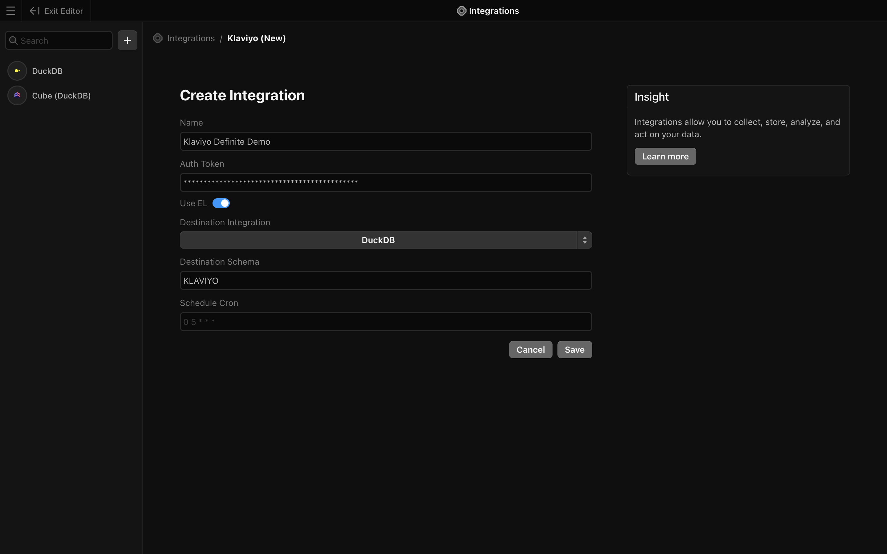 Save. Definite should automatically take you back to the integrations page where you can see your new Klaviyo integration.