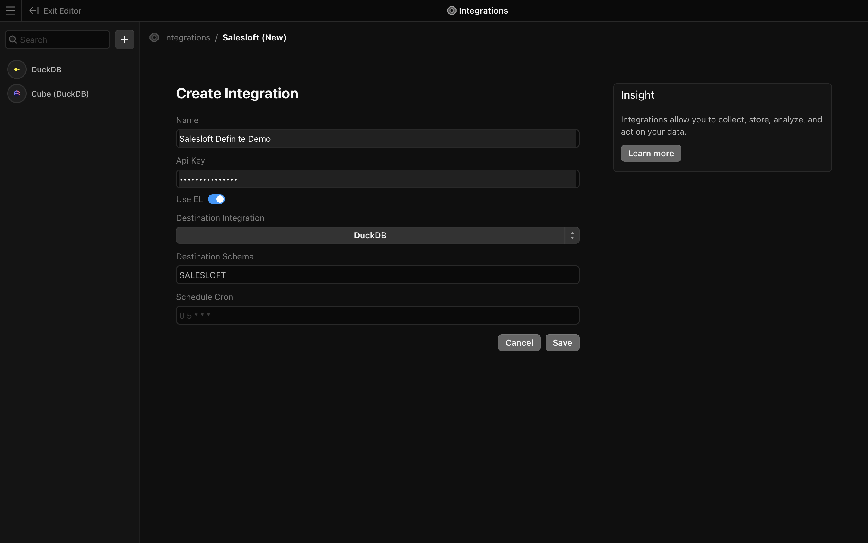 : Should auto-populate with the name `Salesloft“. Only change if you want to rename the schema in which your Salesloft data will be synced to.Schedule Cron