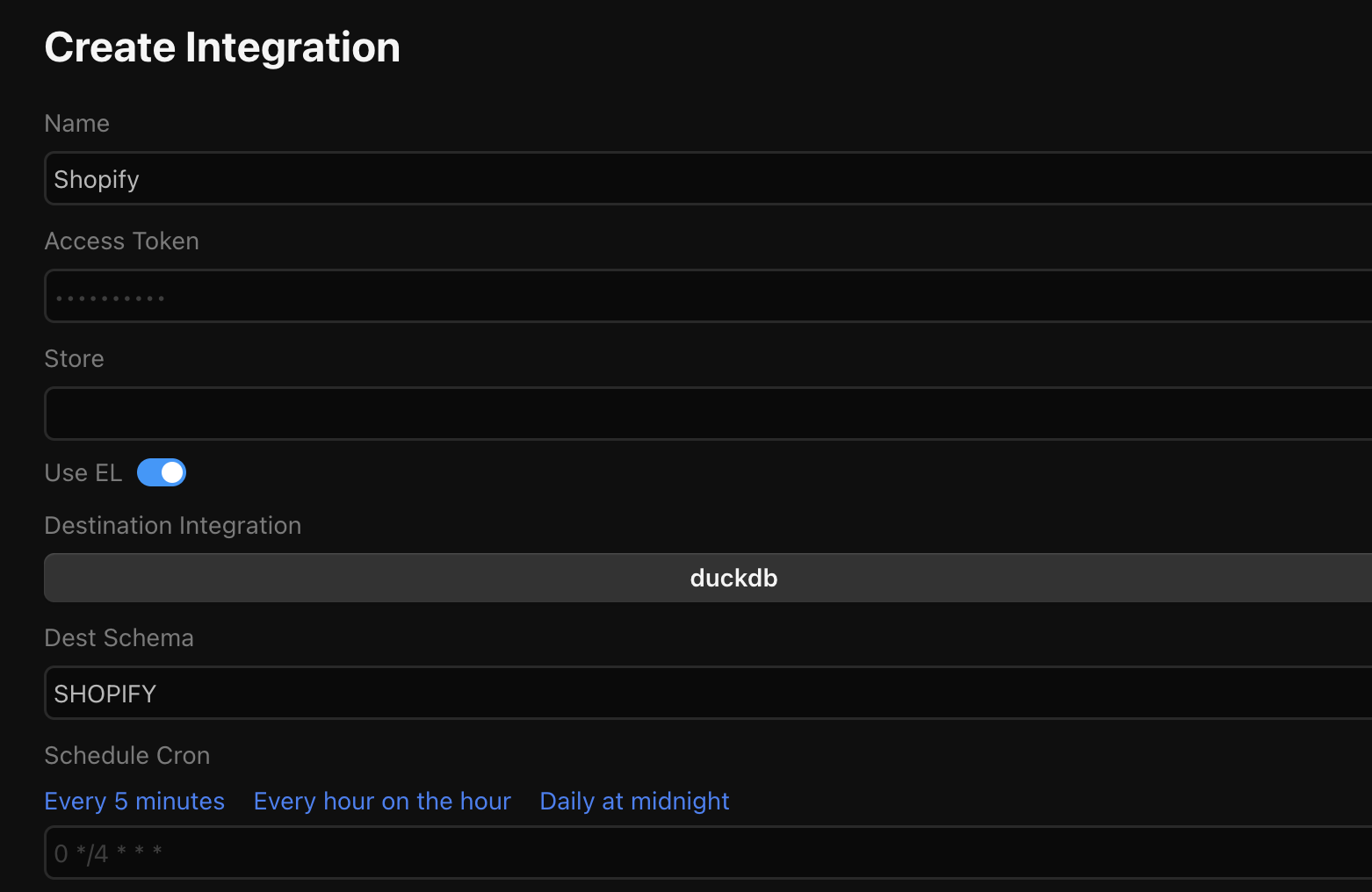 Go to this link to add an integration. Search for our Shopify extractor and click it to get to the creation form.