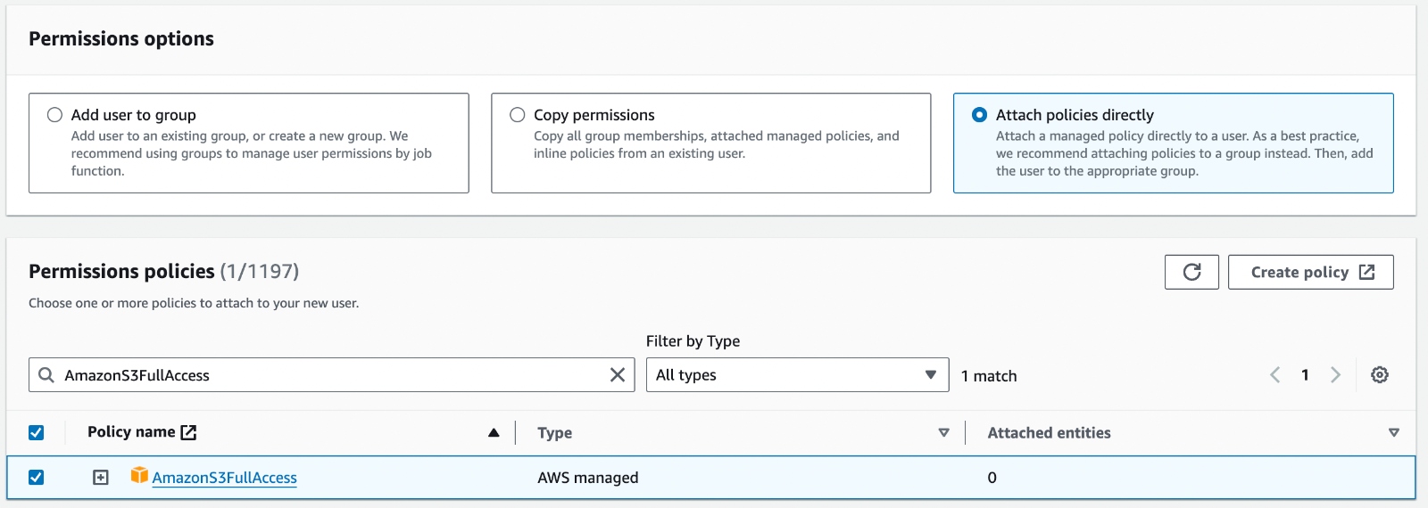If you have a group with the necessary permissions, you can add your user to that group. Otherwise, you can attach policies directly.To attach a policy directly, select “Attach existing policies directly”. Search for “AmazonS3FullAccess” if you wish to grant full access to S3, or search for a more restricted policy if needed.