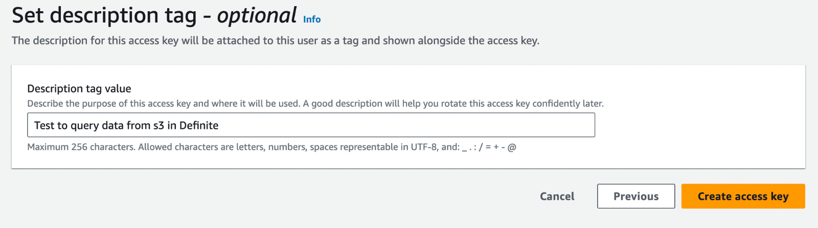 On the next screen you can optionally create a tag for your access key or go ahead and click