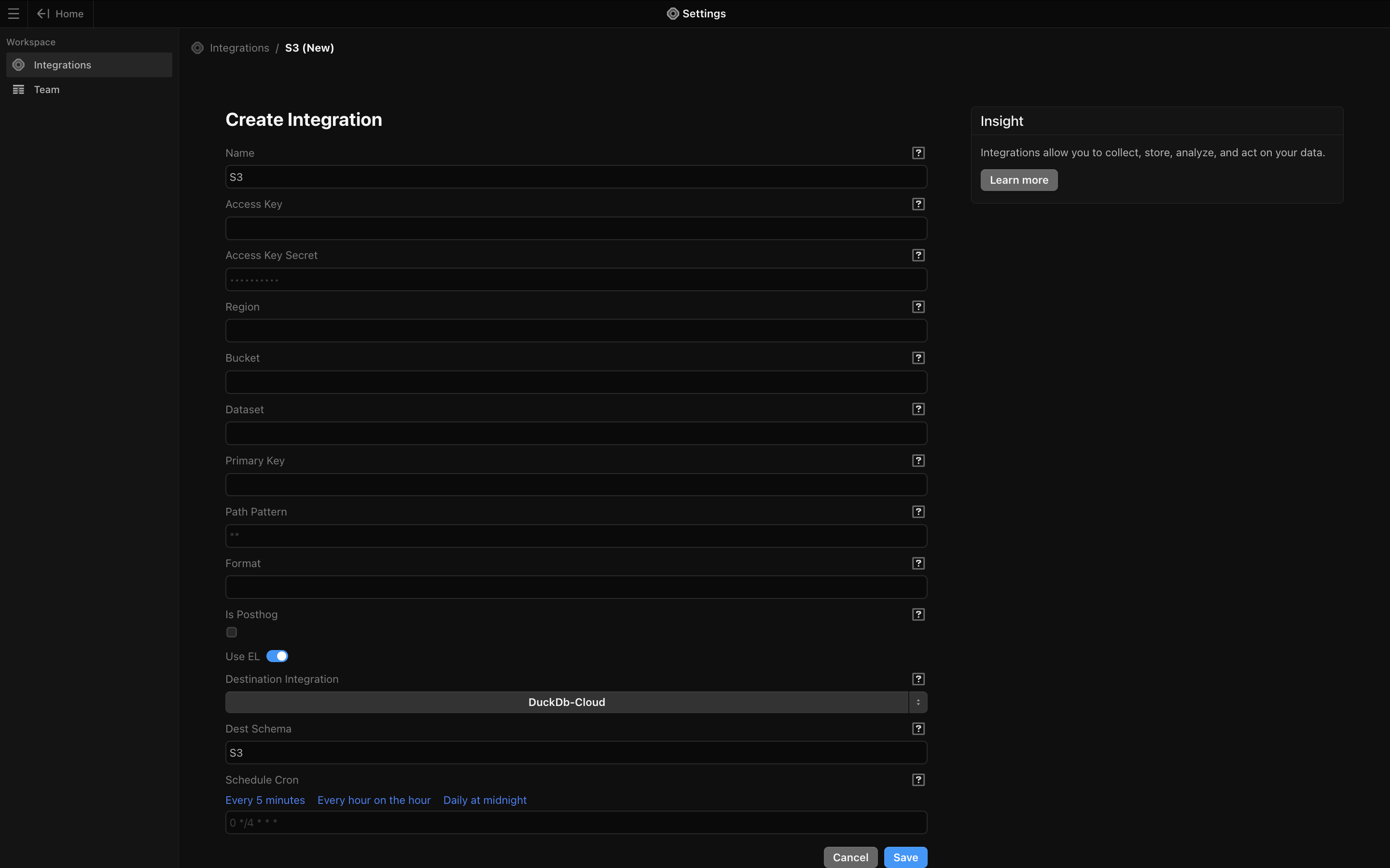 In Definite, go to Settings Integrations and search for S3. Once the S3 menu is up, add in your credentials like so:
